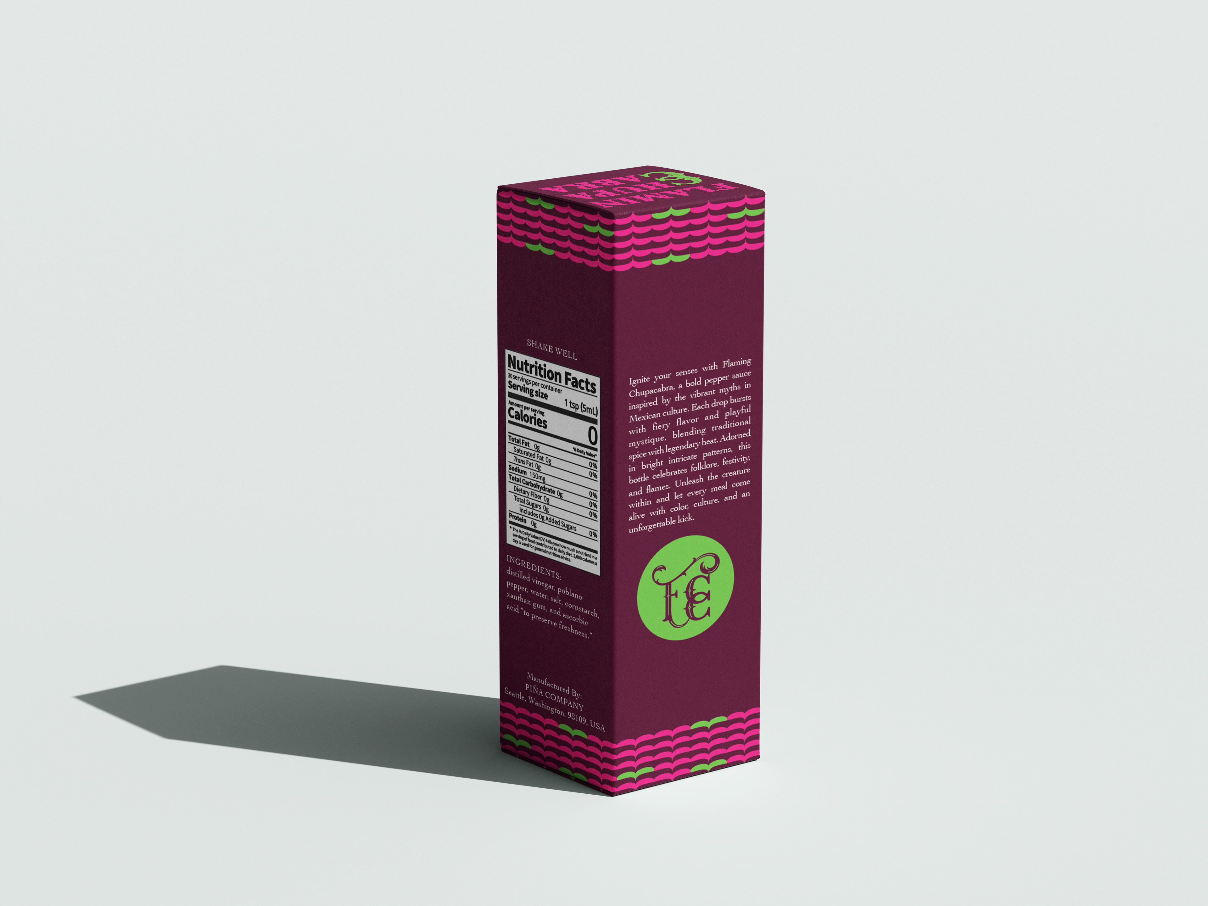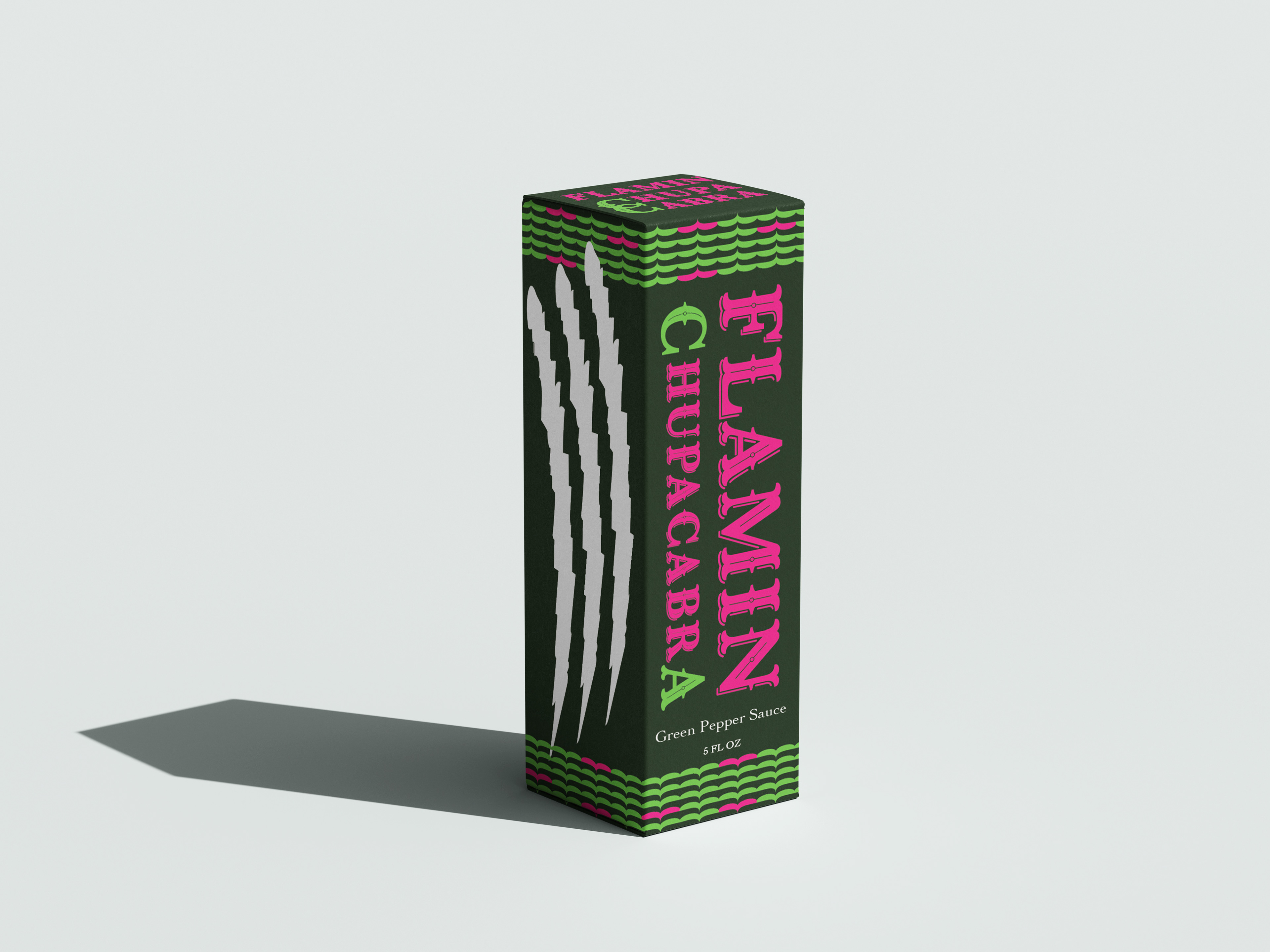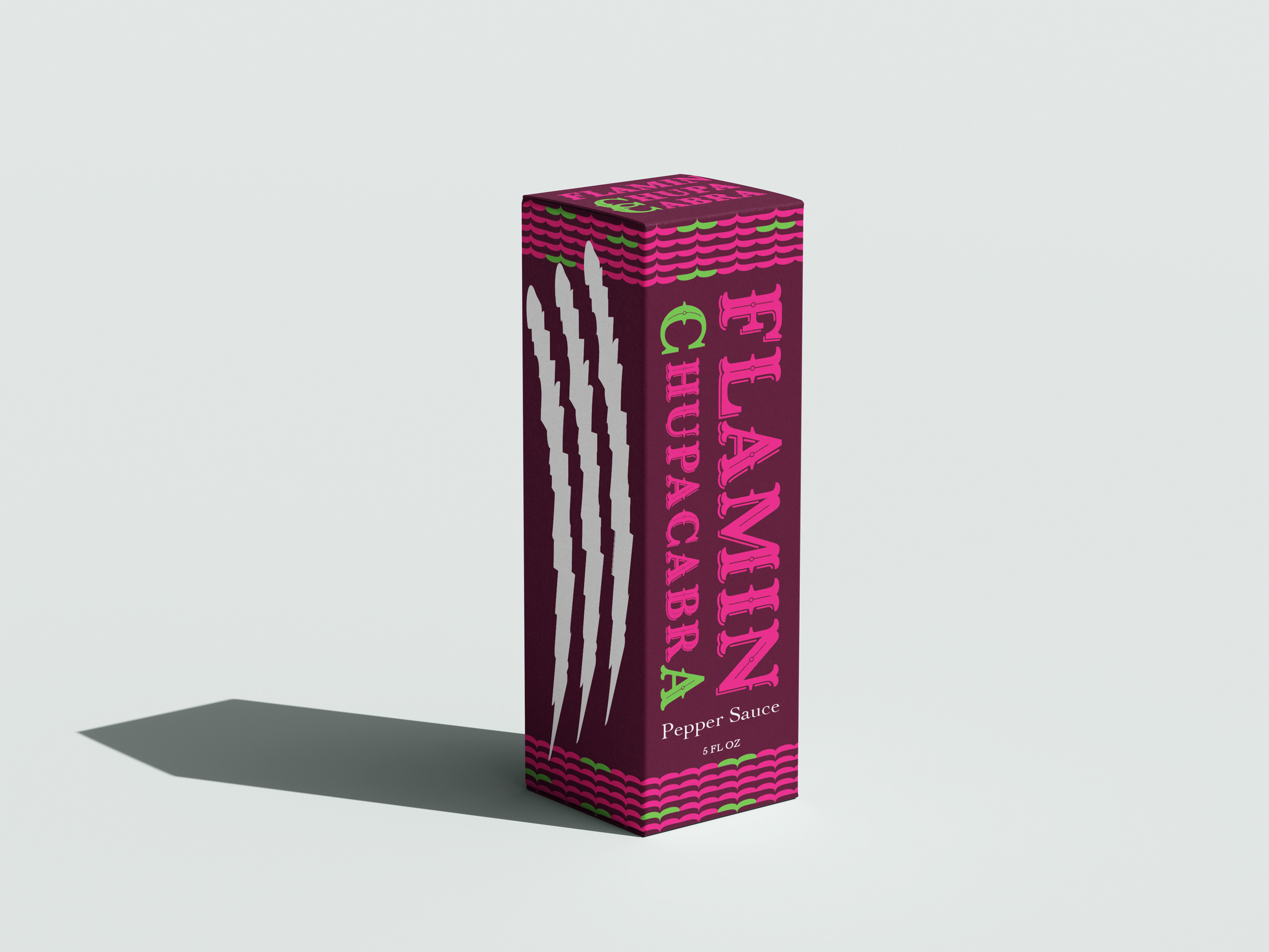 Package branding for a faux hot sauce brand. Branding centered around the namesake and history of the chupacabra, a mythical creature originating from Northern Mexico. Due to the origin of the myth, the font was chosen for its western, cowboy-esque feel. The shape of the label, colors, and patterns were all inspired by papel picado, a traditional decoration seen in Mexico.