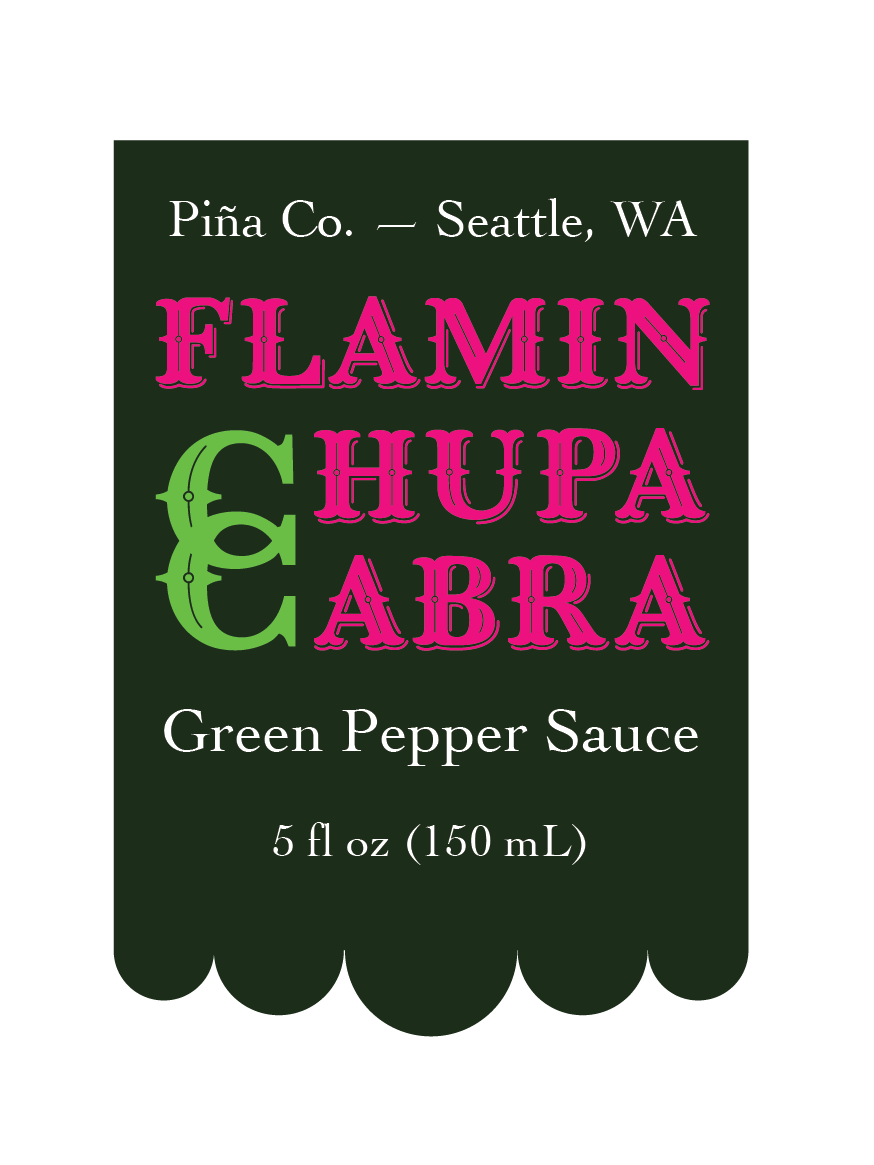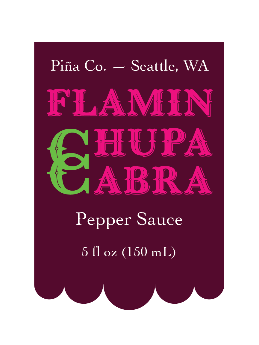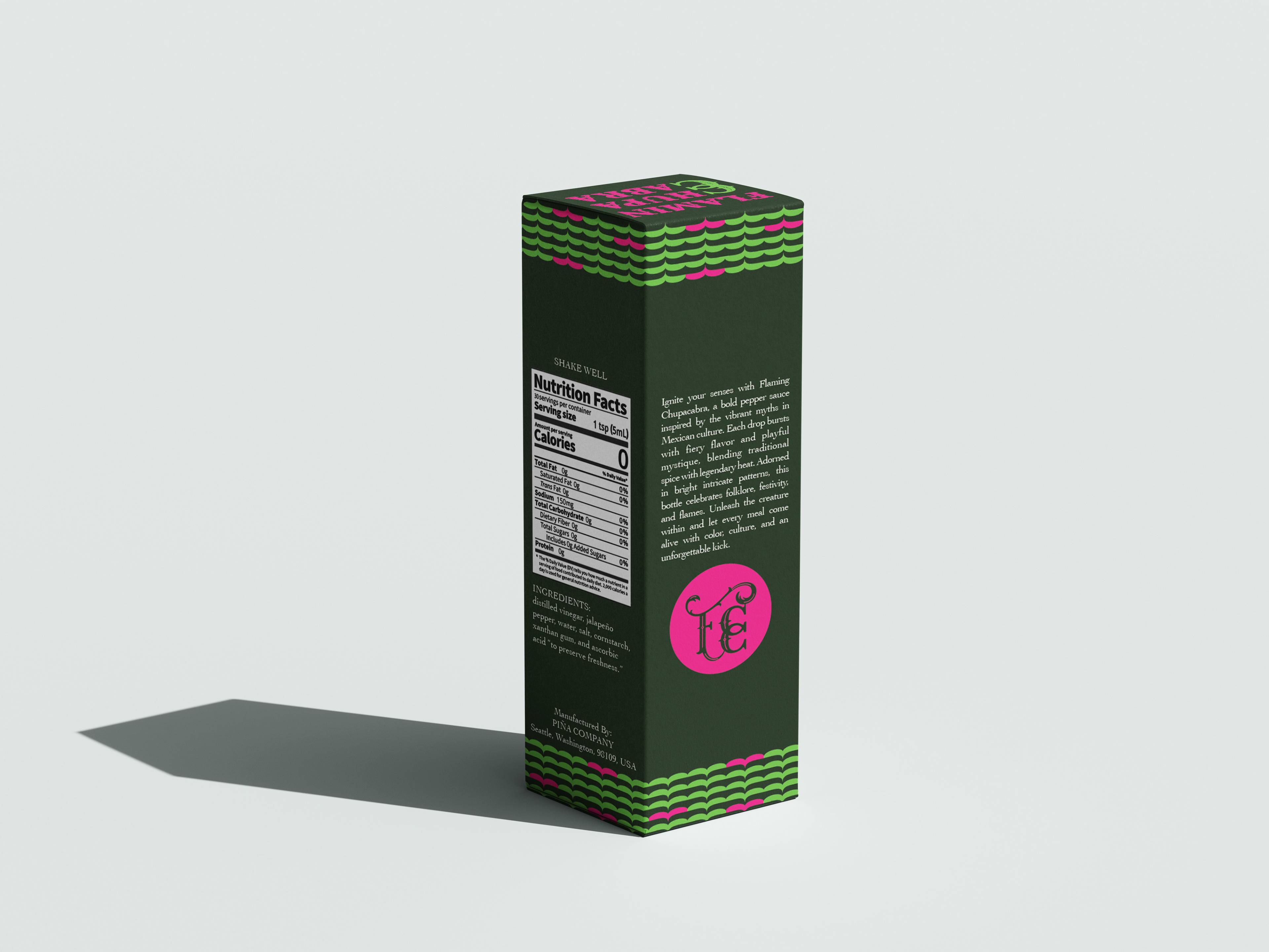 Package branding for a faux hot sauce brand. Branding centered around the namesake and history of the chupacabra, a mythical creature originating from Northern Mexico. Due to the origin of the myth, the font was chosen for its western, cowboy-esque feel. The shape of the label, colors, and patterns were all inspired by papel picado, a traditional decoration seen in Mexico.