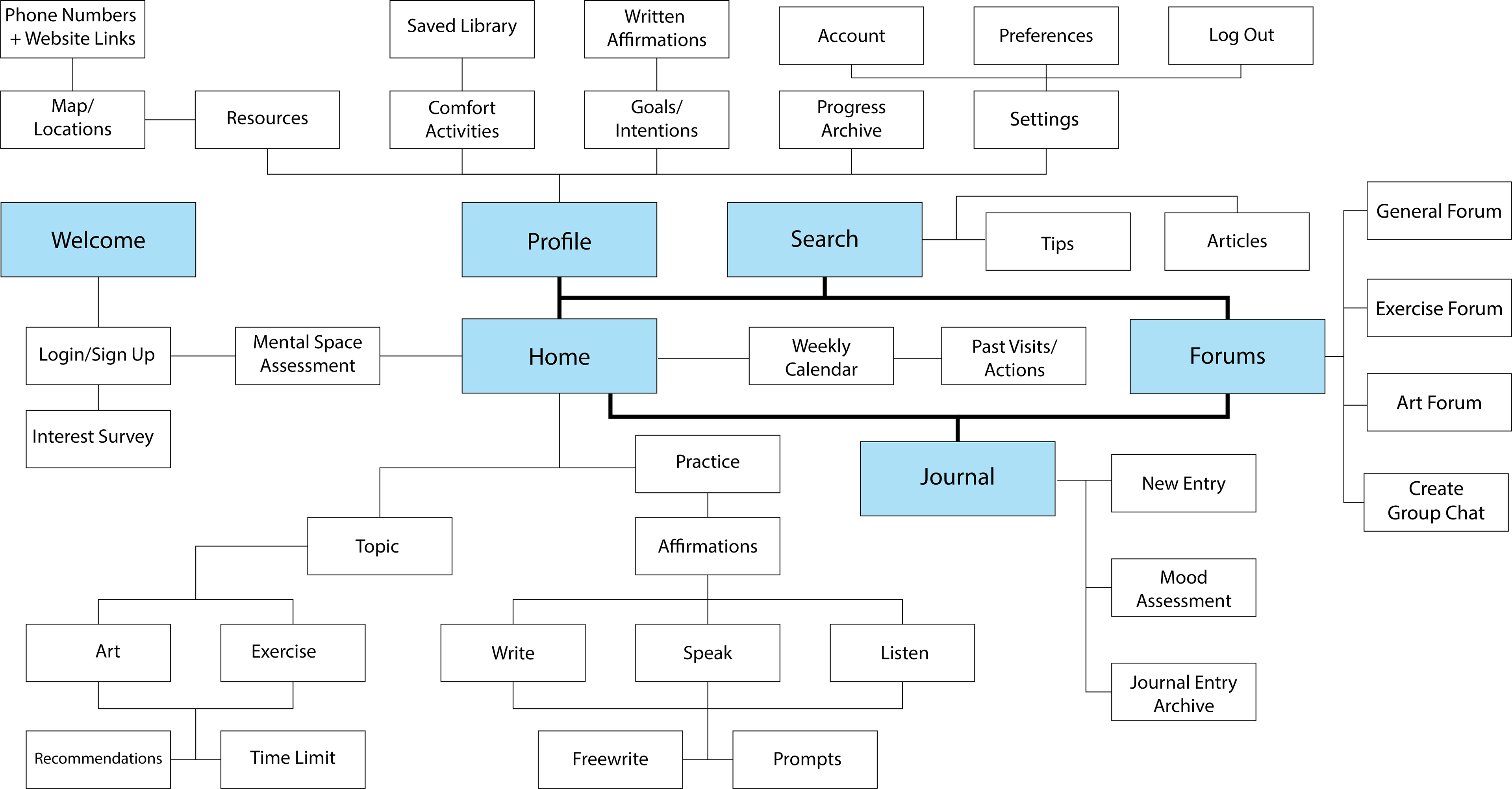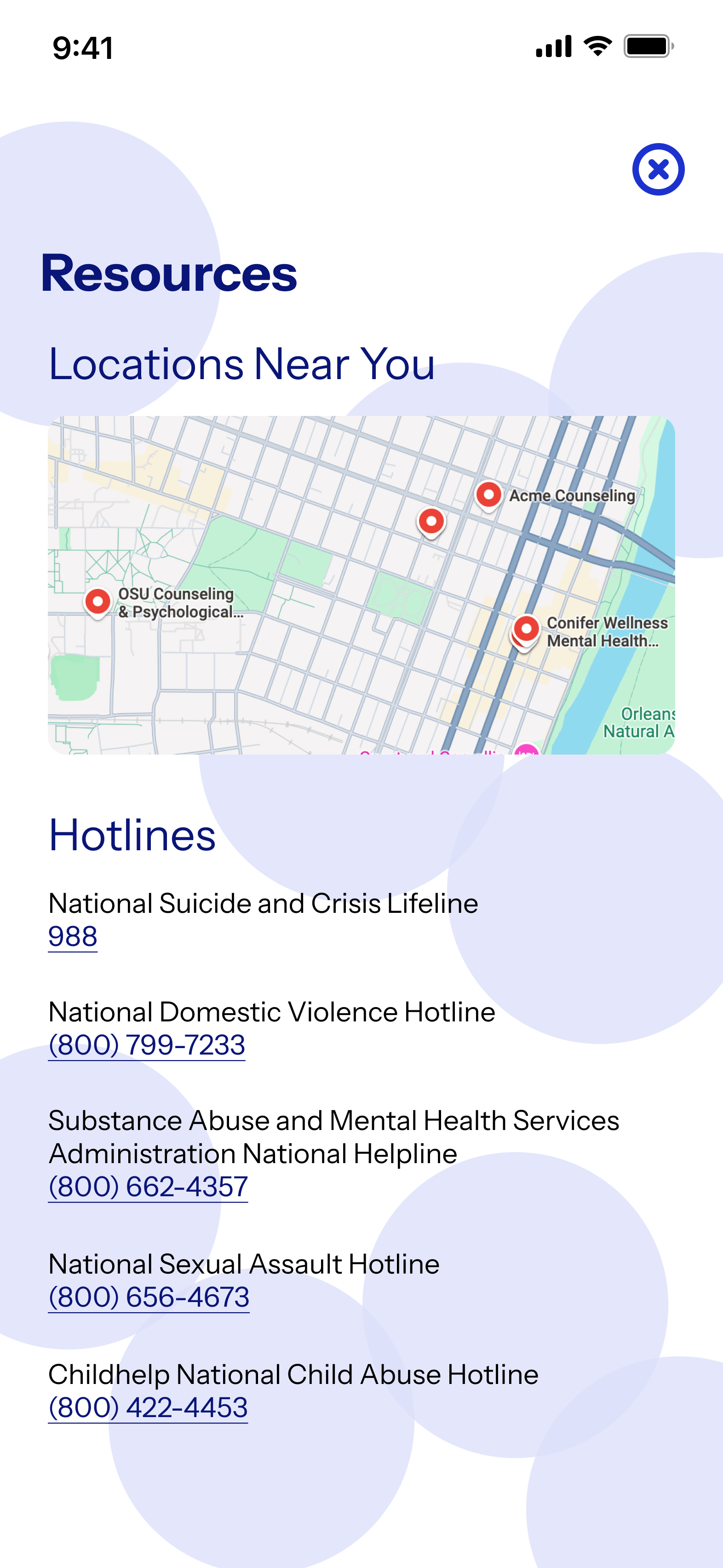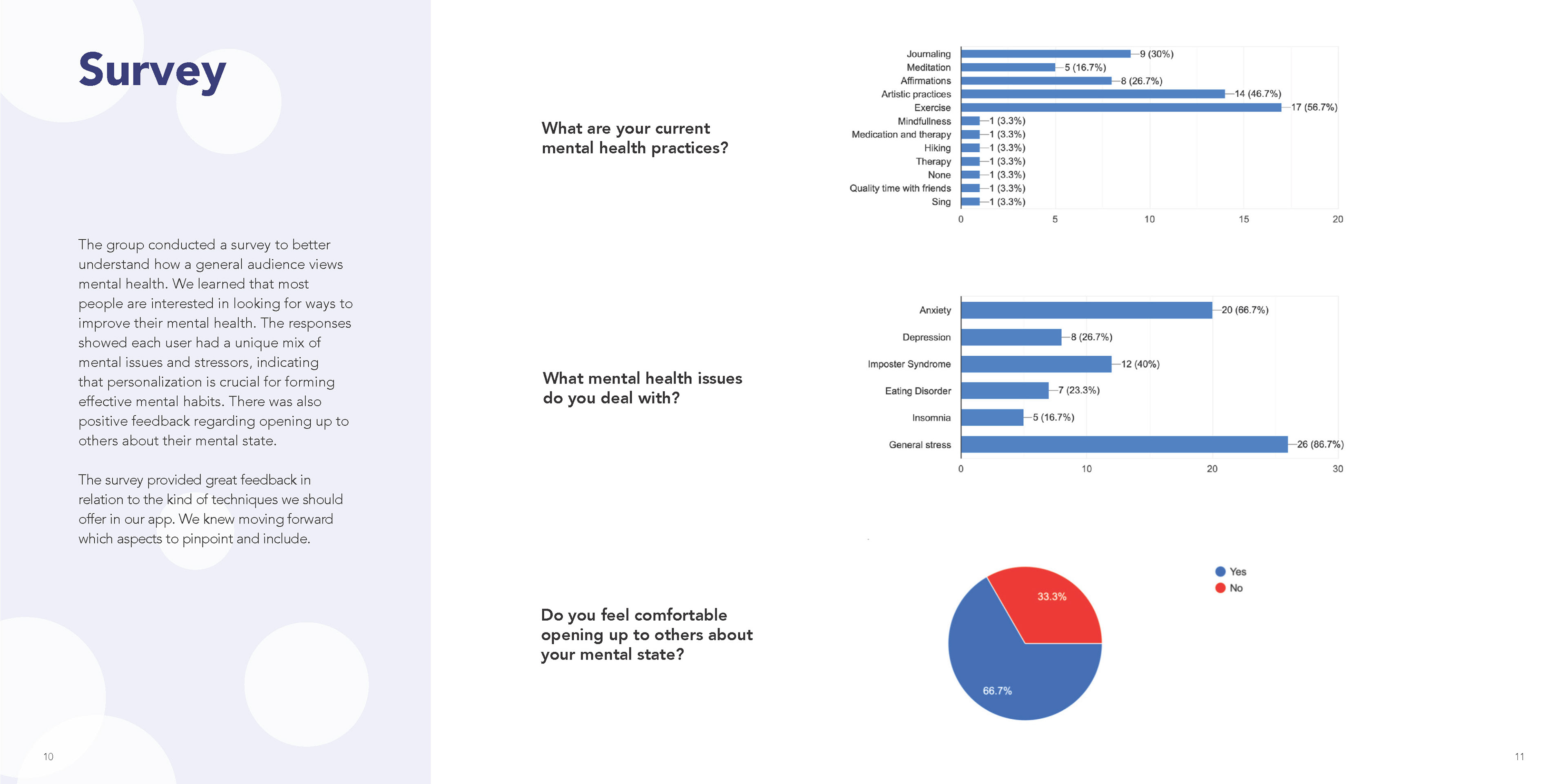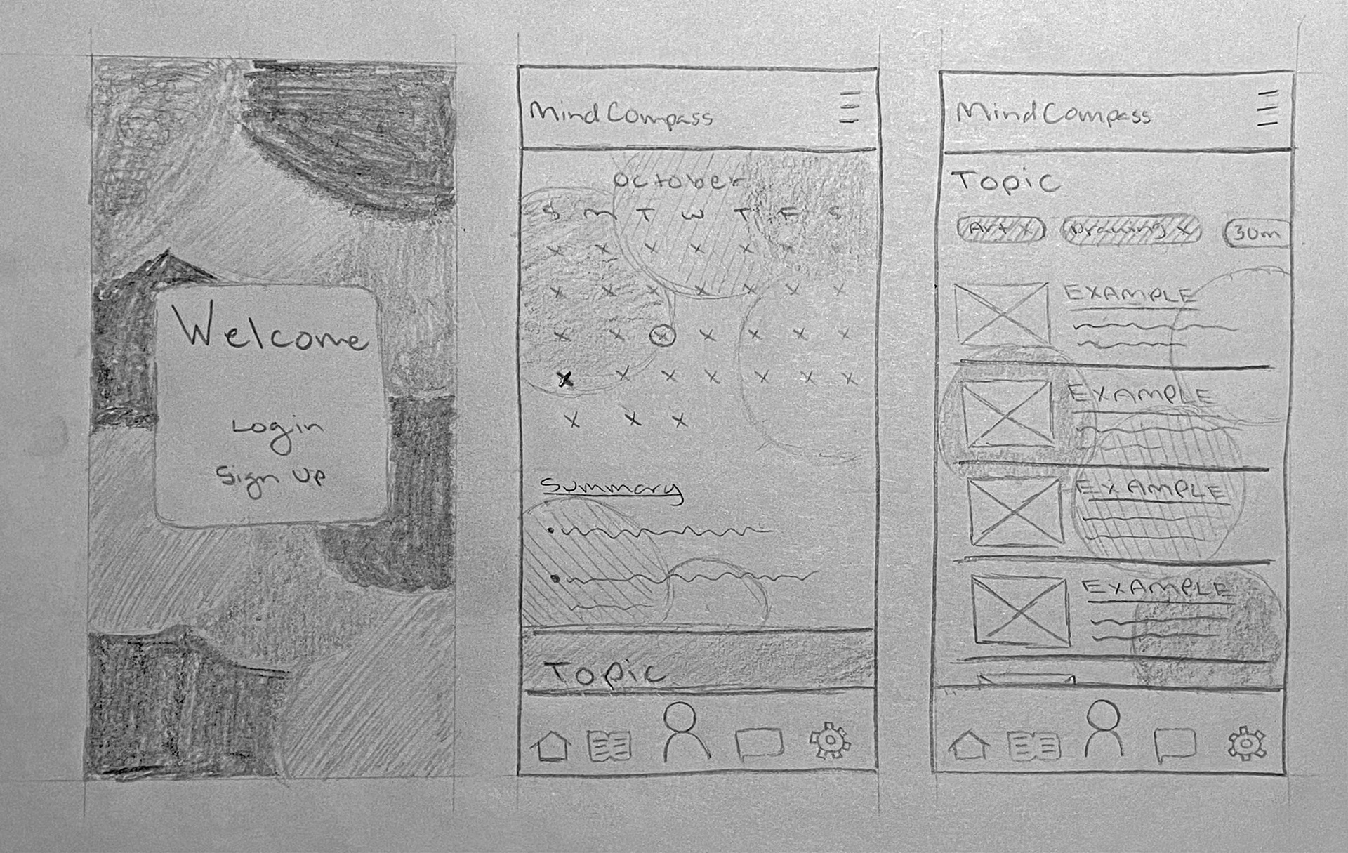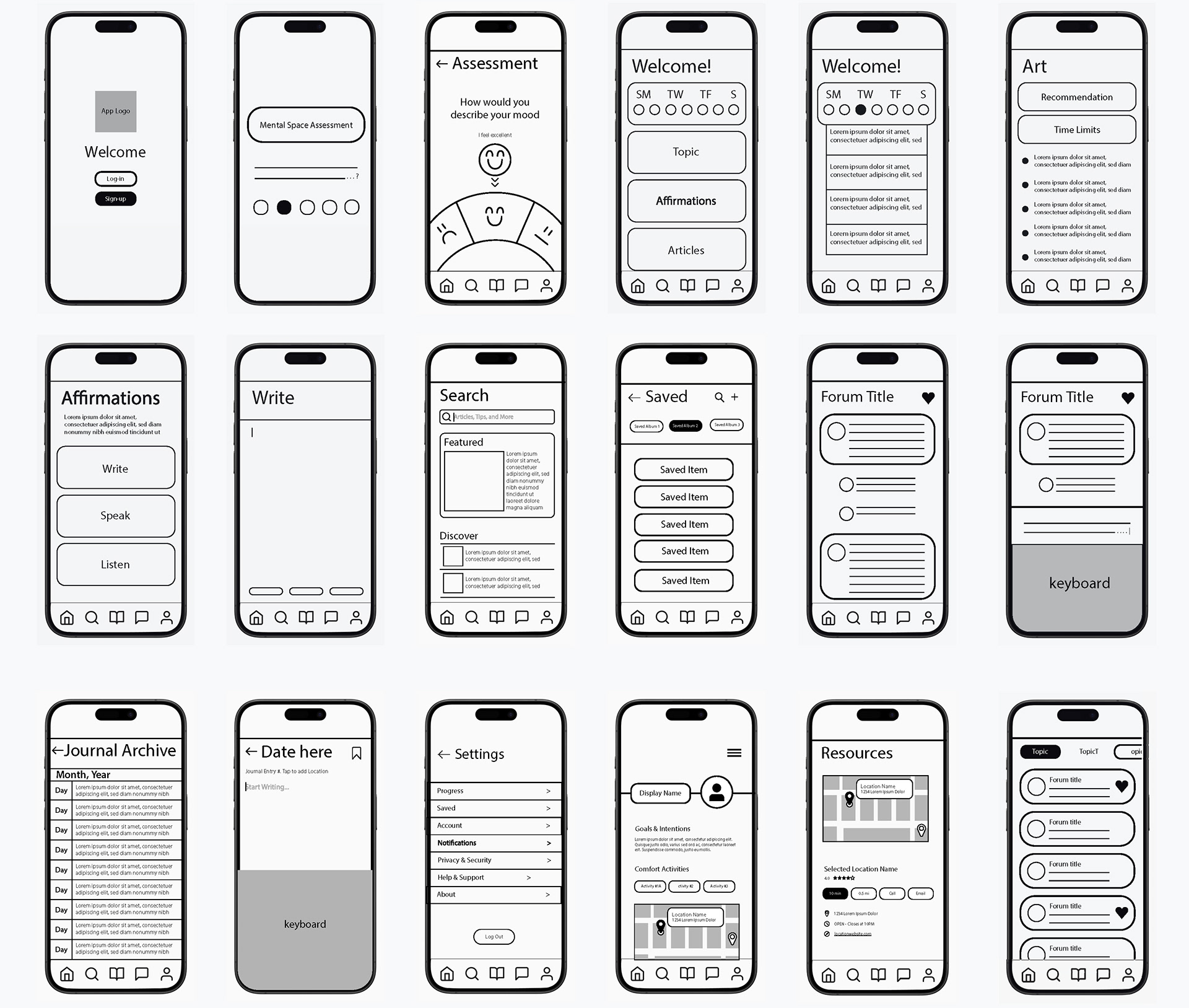 UX/UI Design for a mental health app. Goals were to develop a free, personalized app to help users find peace and track their mental health.