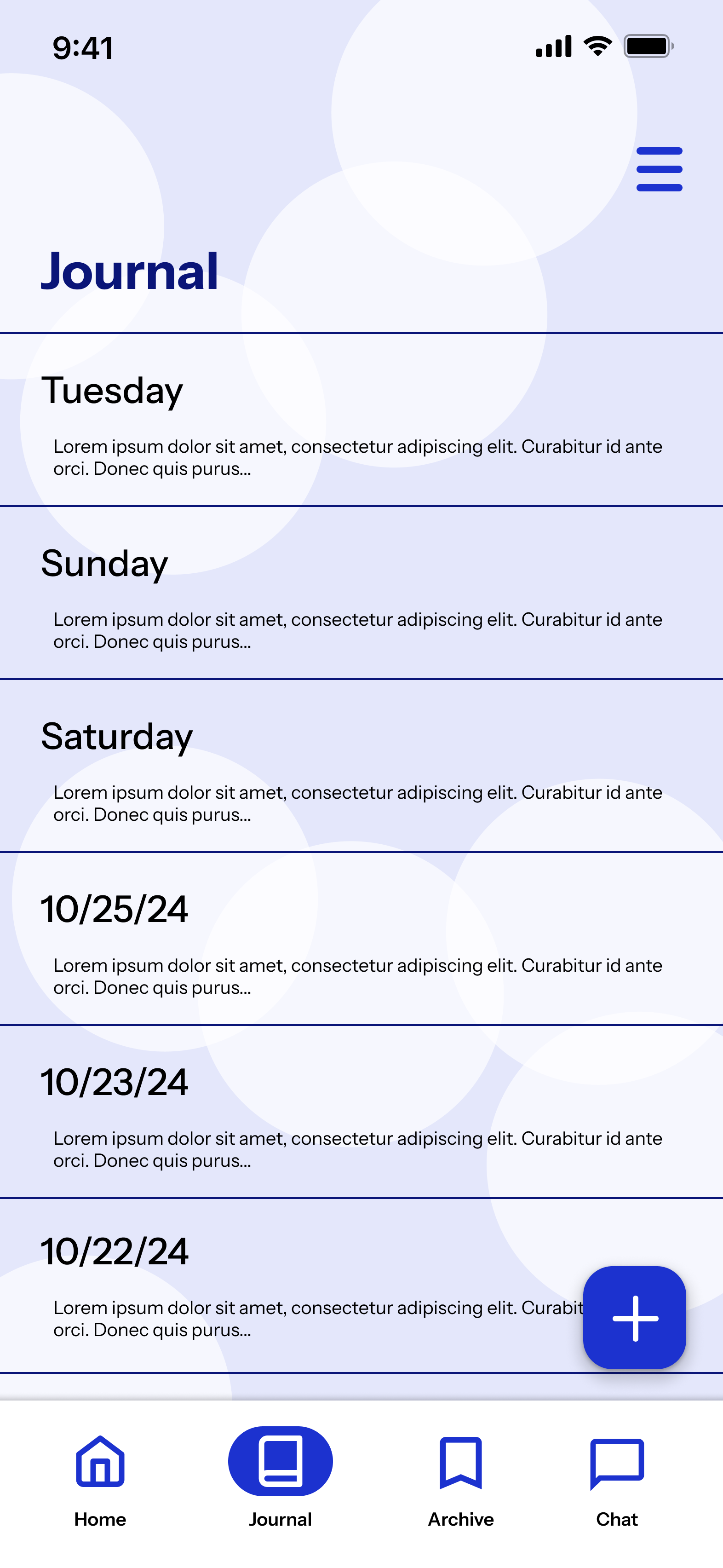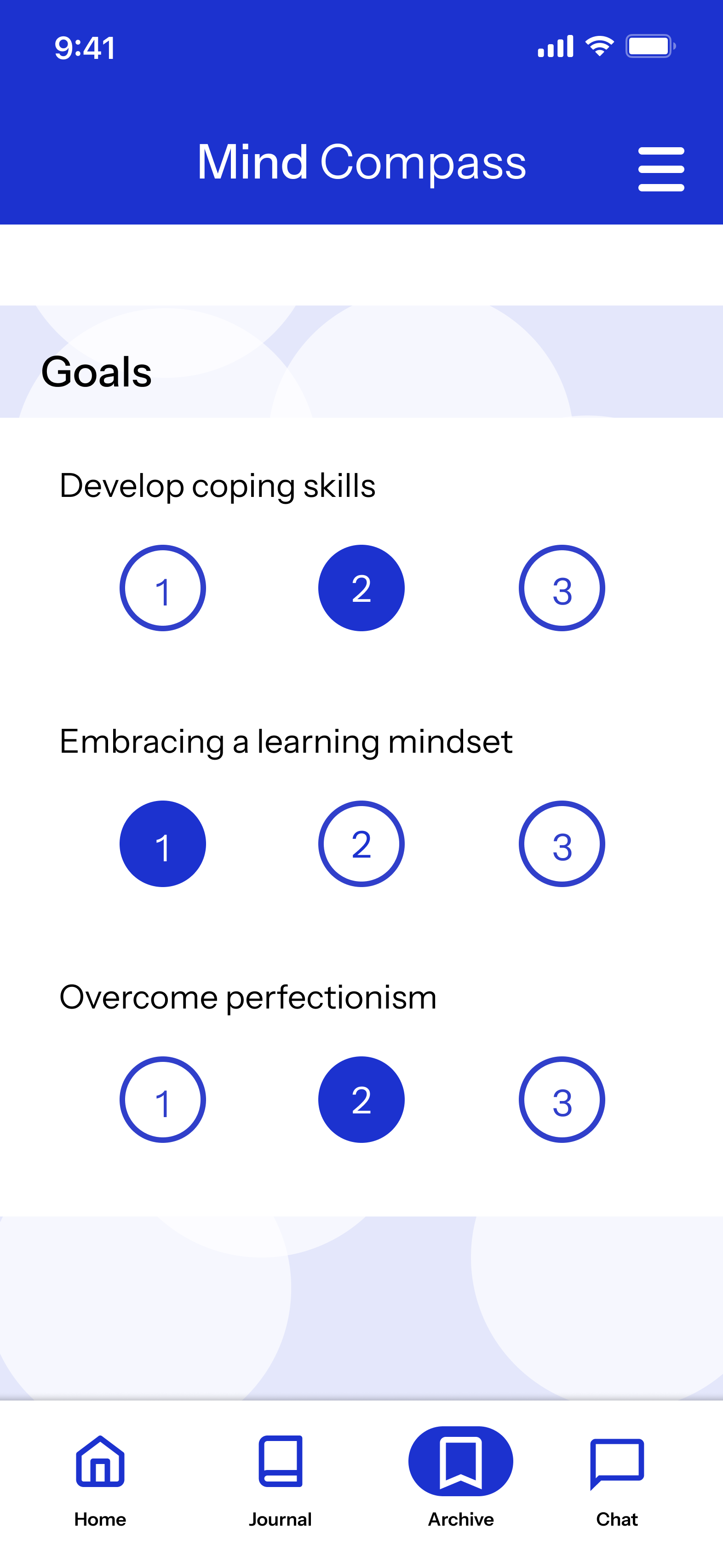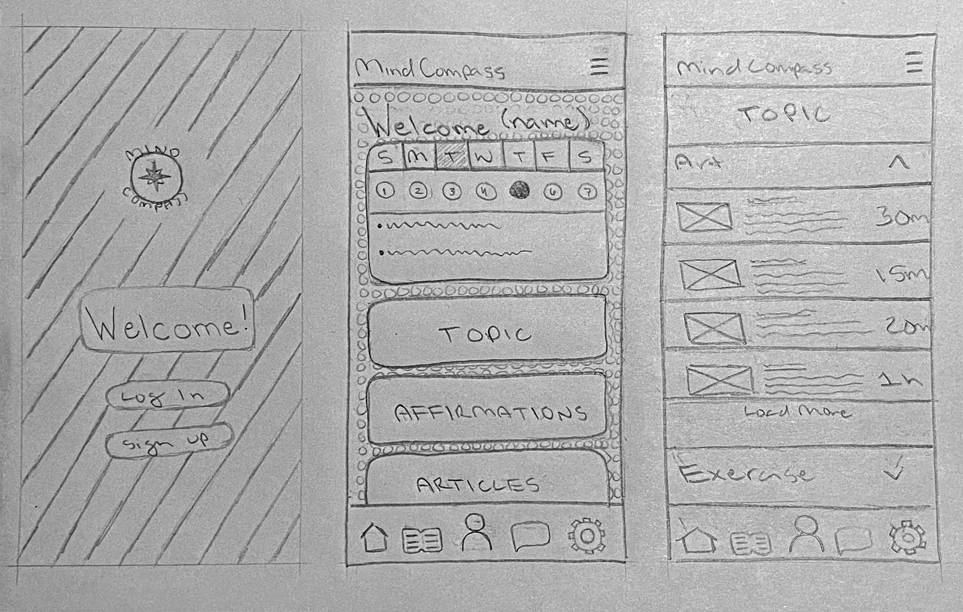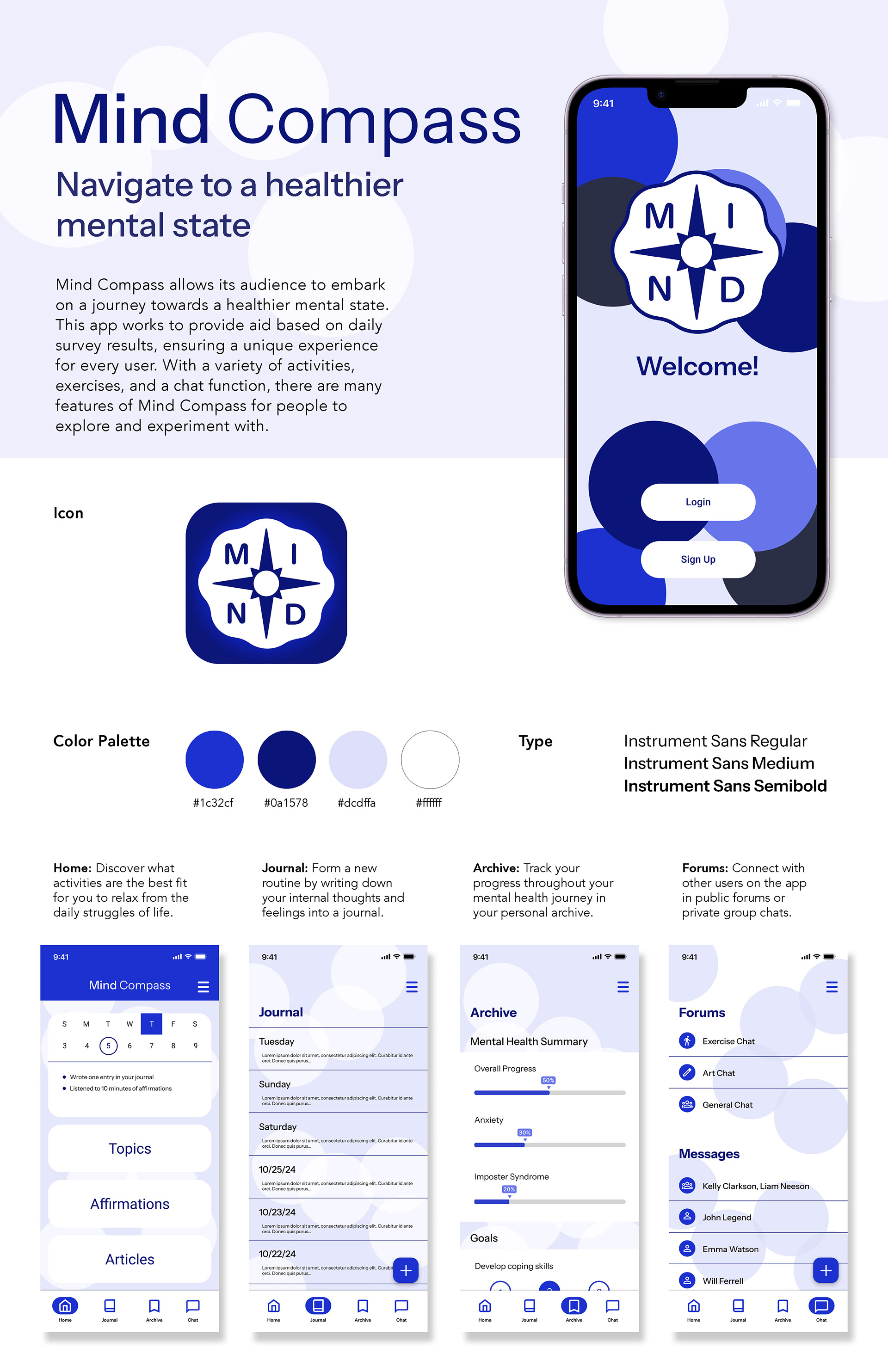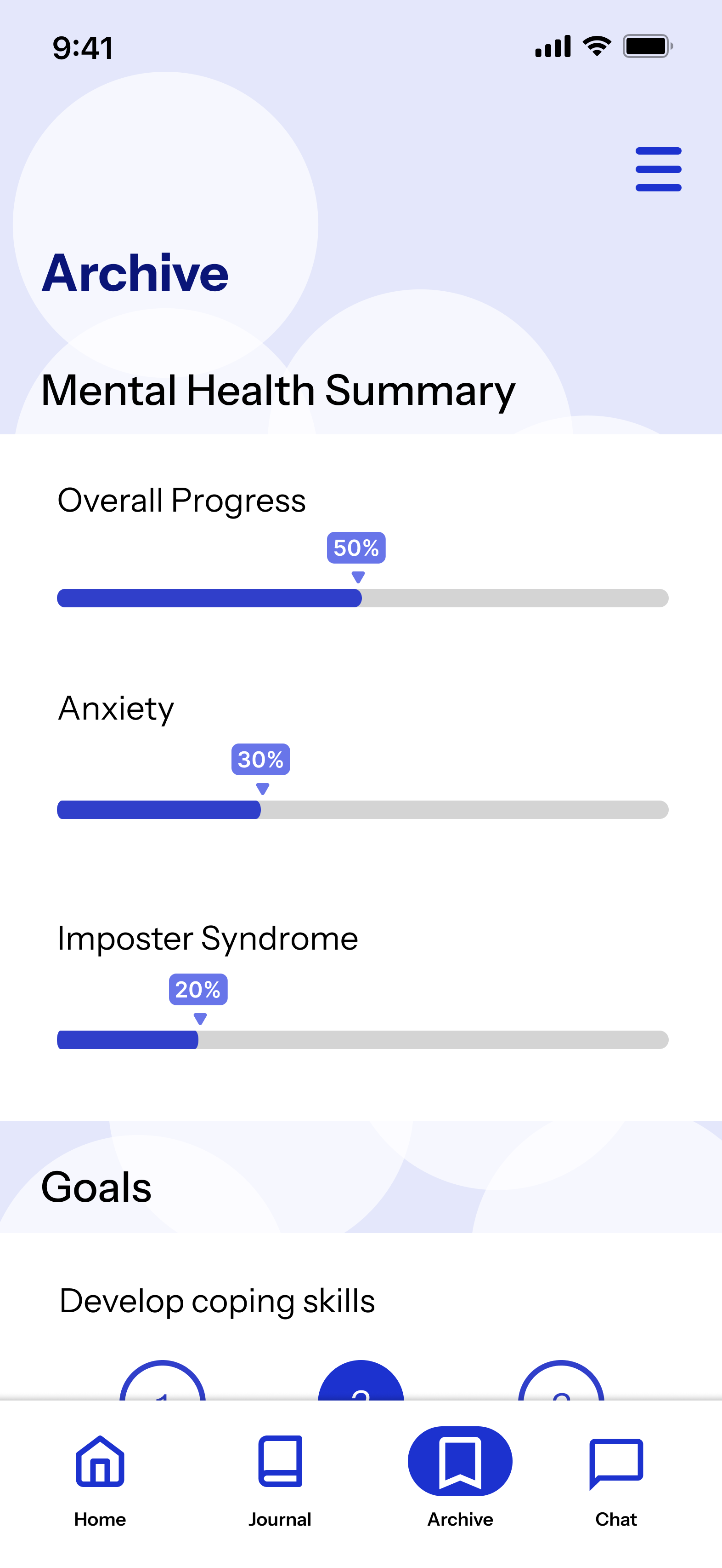 UX/UI Design for a mental health app. Goals were to develop a free, personalized app to help users find peace and track their mental health.