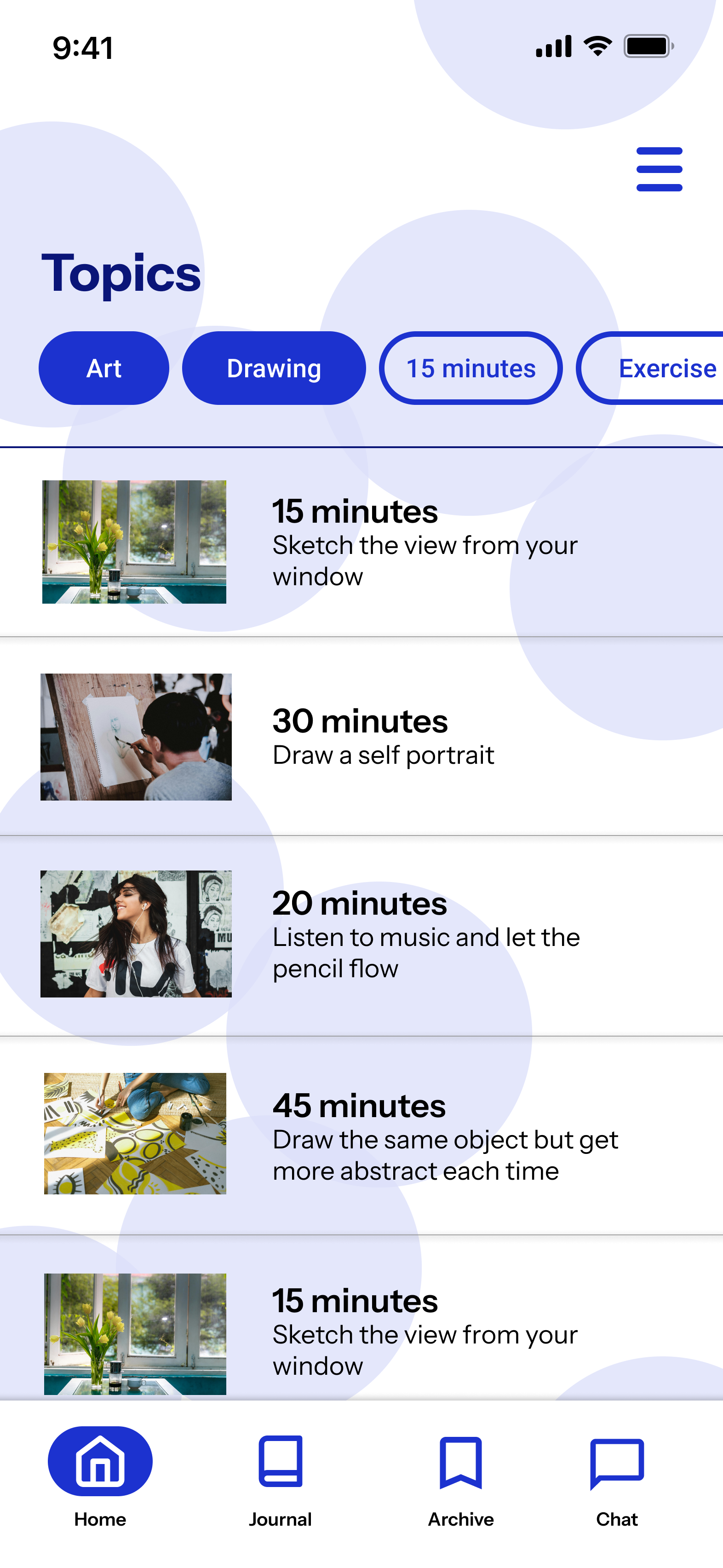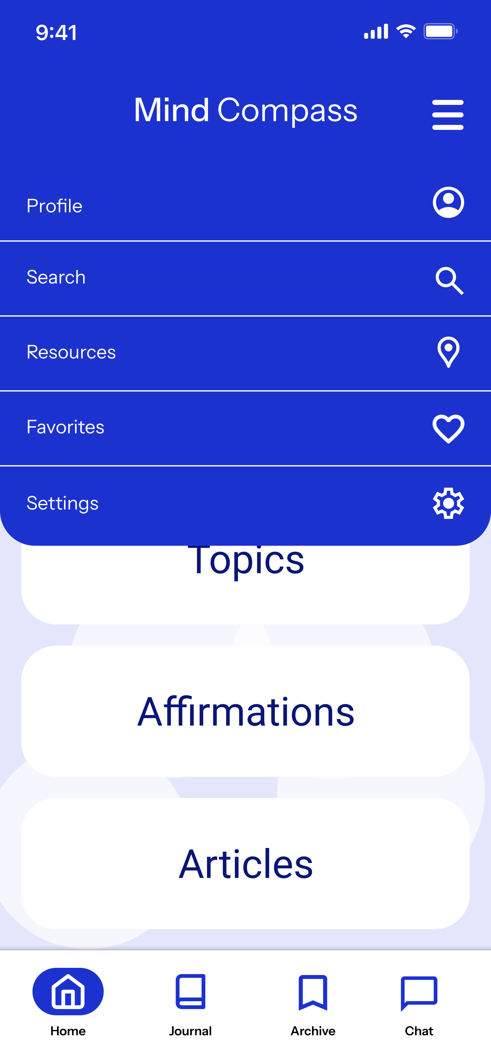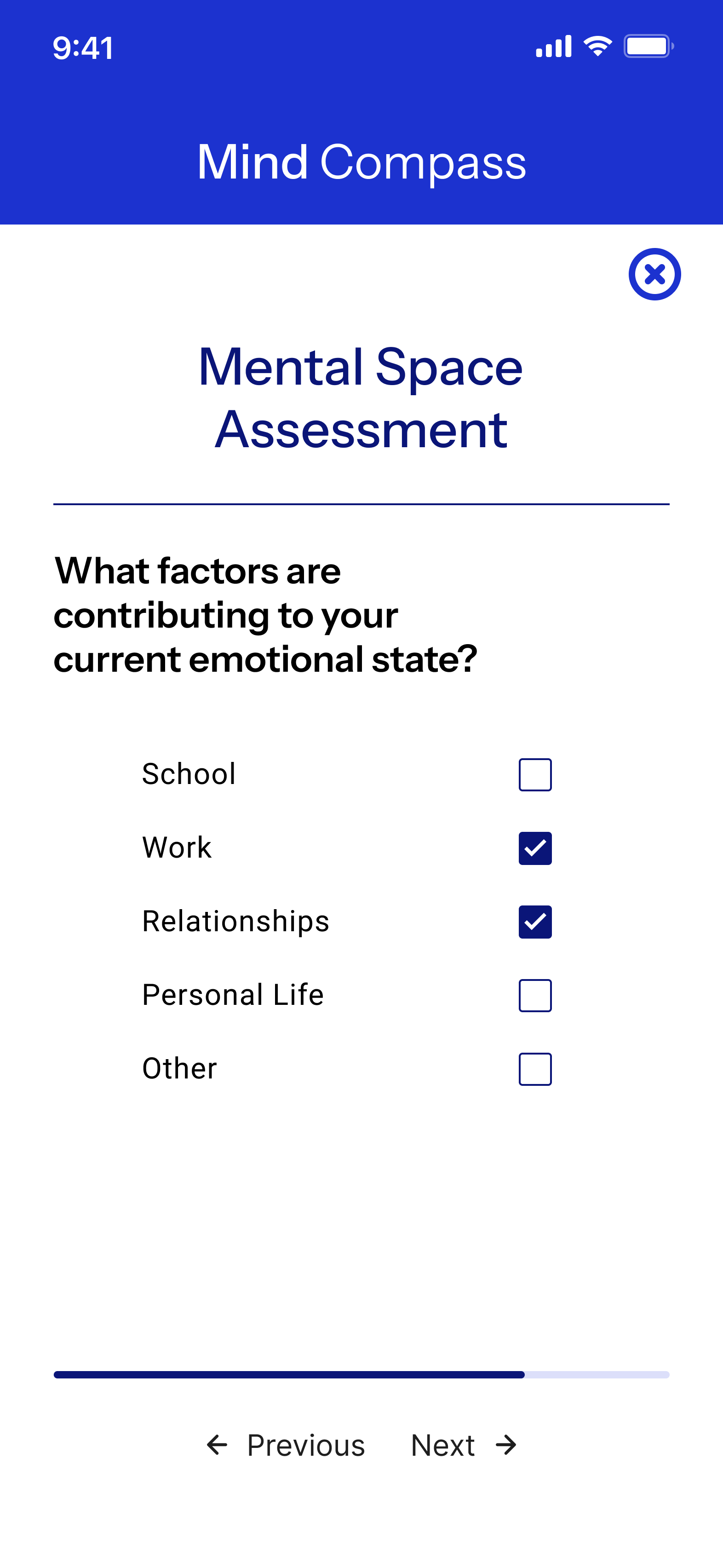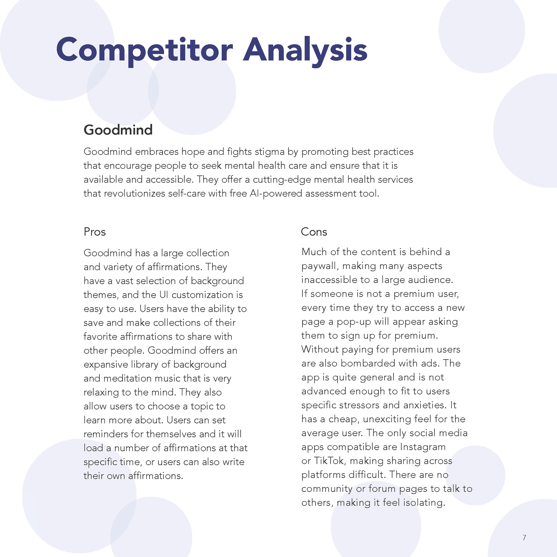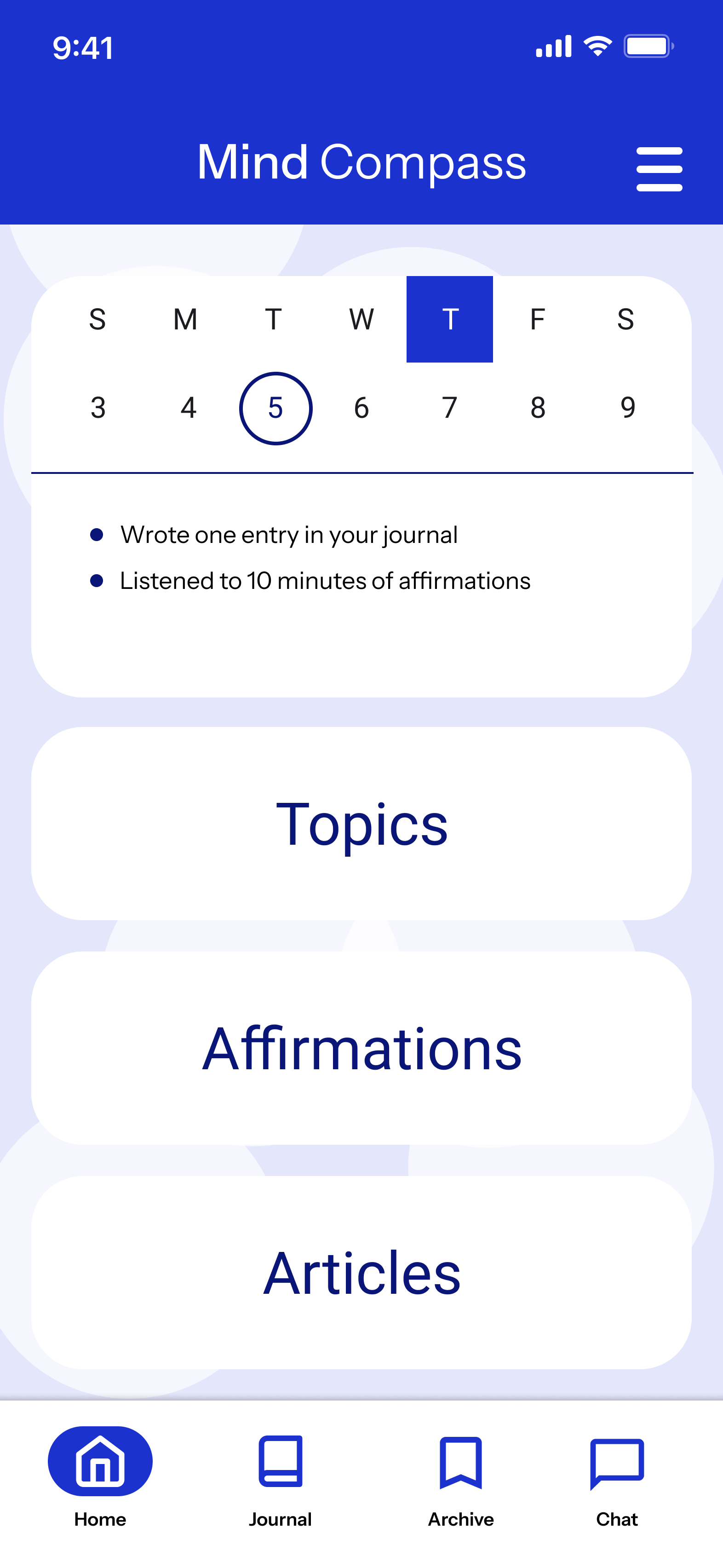 UX/UI Design for a mental health app. Goals were to develop a free, personalized app to help users find peace and track their mental health.