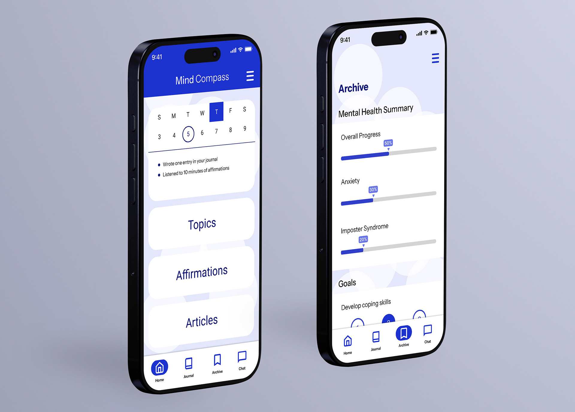 Research into competitors revealed users felt lumped together with general advice and nonspecific affirmations. It was important that the app included elements individual to each user, which included a daily mental health survey, an archive featuring people's progress on their mental health journey, and a wide range of activities that could be tailored by each user.